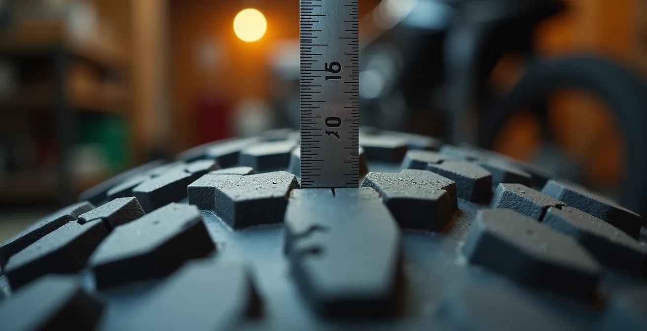 Como inspector, cada día veo motoristas que llegan a la estación de ITV con los neumáticos en las últimas. La conversación es casi siempre la misma: intentan estirar la vida de las gomas para «ahorrar» unos euros, cruzando los dedos para pasar la inspección. Creen que el único riesgo es una multa o un resultado desfavorable. Es un error de cálculo garrafal. La mayoría se enfoca en el testigo de desgaste y en el método de la moneda de un euro, ignorando que la verdadera seguridad no reside en ese mínimo legal de 1,6 milímetros, sino en la capacidad real del neumático para evacuar agua y mantener el agarre químico.